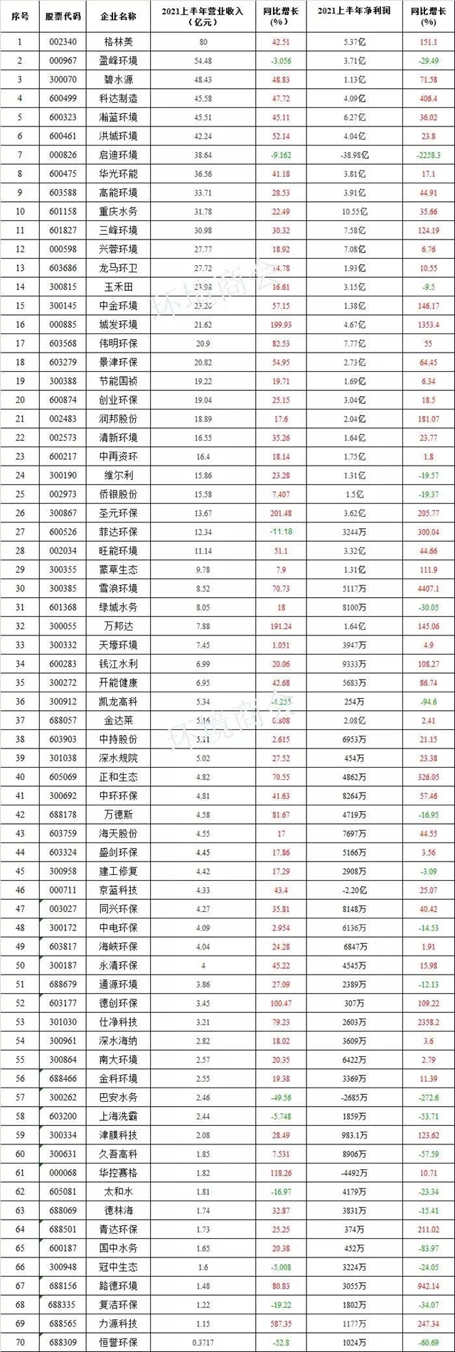A股70家环境企业半年报统计。数据来源:全国工商联环境商会▼